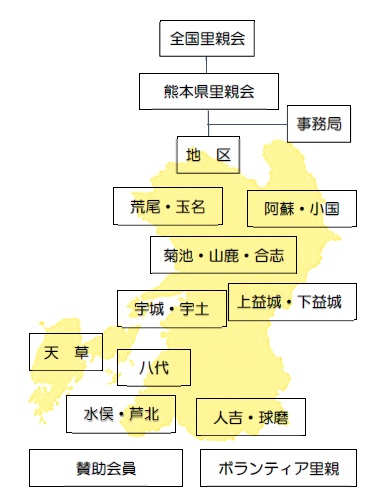 熊本県内に居住する里親(養育里親・養子縁組里親・親族里親・専門里親)の正会員と、多様な子育てニーズに応えるボランティア里親会員、会の趣旨に賛同する賛助会員で構成されており、本会は、公益財団法人全国里親会の傘下にあり、熊本県における社会的養護の一端を担っており、家庭養育の社会的認知と養育環境の向上のために活動しています。